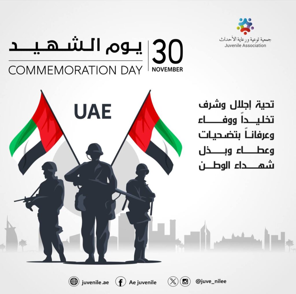 أحيت جمعية توعية ورعاية الأحداث ذكرى يوم الشهيد، الذي يصادف 30 نوفمبر من كل عام، تقديرًا لتضحيات أبناء الإمارات الأبرار الذين جادوا بأرواحهم دفاعًا عن الوطن ورفعته، وترسيخًا للمعاني السامية للولاء والانتماء والوفاء لقيادة الدولة وشعبها.